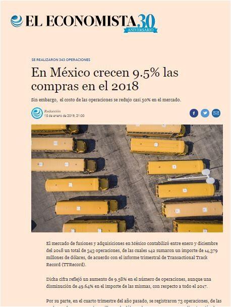 El mercado de fusiones y adquisiciones en México contabilizó entre enero y diciembre del 2018 un total de 343 operaciones, de las cuales 142 sumaron un importe de 14,379 millones de dólares, de acuerdo con el informe trimestral de Transactional Track Record (TTRecord).