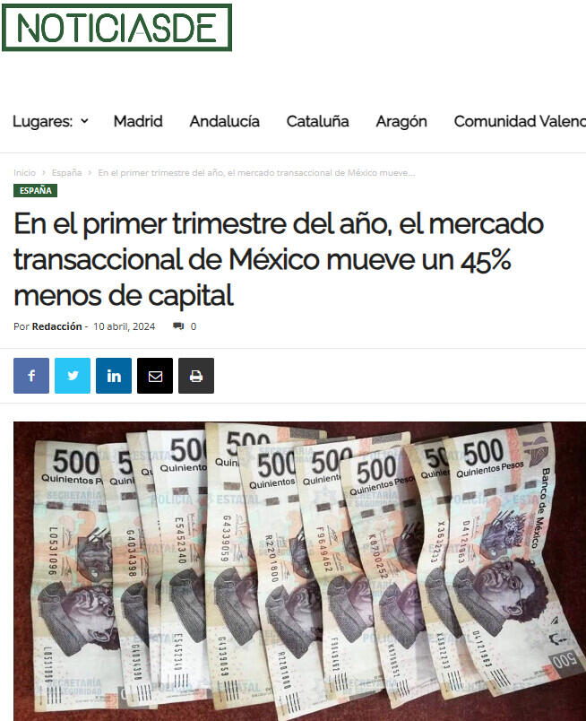 El mercado de transacciones en México ha contabilizado en el primer trimestre del año un total de 69 operaciones, de las cuales 35 suman un importe no confidencial de 967 millones de dólares (863 millones de euros), lo que se traduce en un descenso del 27% en el número de transacciones y una disminución del 45% en su importe, con respecto al mismo período de 2023.