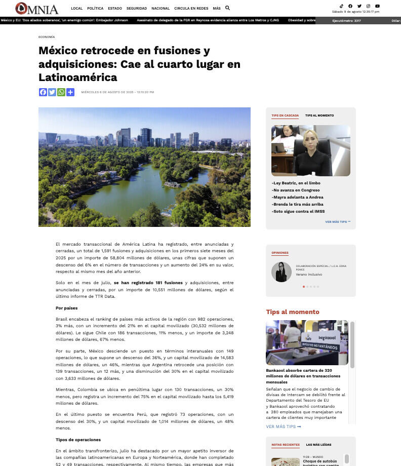 El mercado transaccional de América Latina ha registrado, entre anunciadas y cerradas, un total de 1,591 fusiones y adquisiciones en los primeros siete meses del 2025 por un importe de 58,804 millones de dólares, unas cifras que suponen un descenso del 6% en el número de transacciones y un aumento del 24% en su valor, respecto al mismo mes del año anterior.
