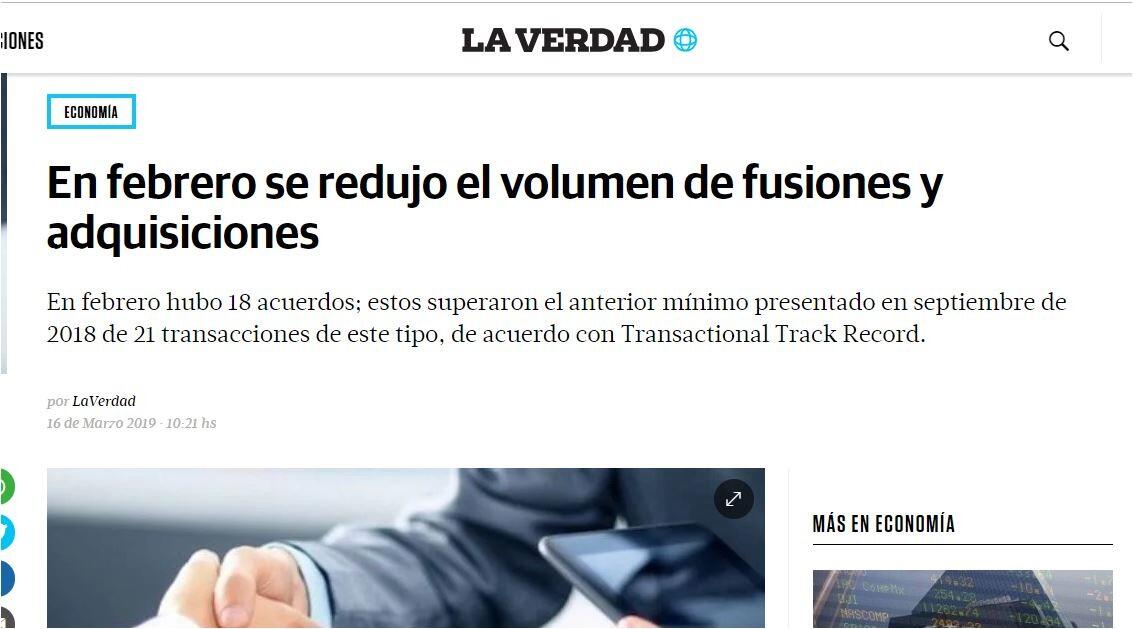 En febrero hubo 18 acuerdos; estos superaron el anterior mínimo presentado en septiembre de 2018 de 21 transacciones de este tipo, de acuerdo con Transactional Track Record.