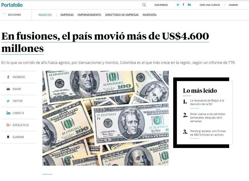 Asimismo comentó que, otro de los motivos que explican el buen comportamiento que está teniendo Colombia en esta materia frente a la región, es el aumento de transacciones mayores a US$100 millones con respecto al mismo periodo del año pasado.