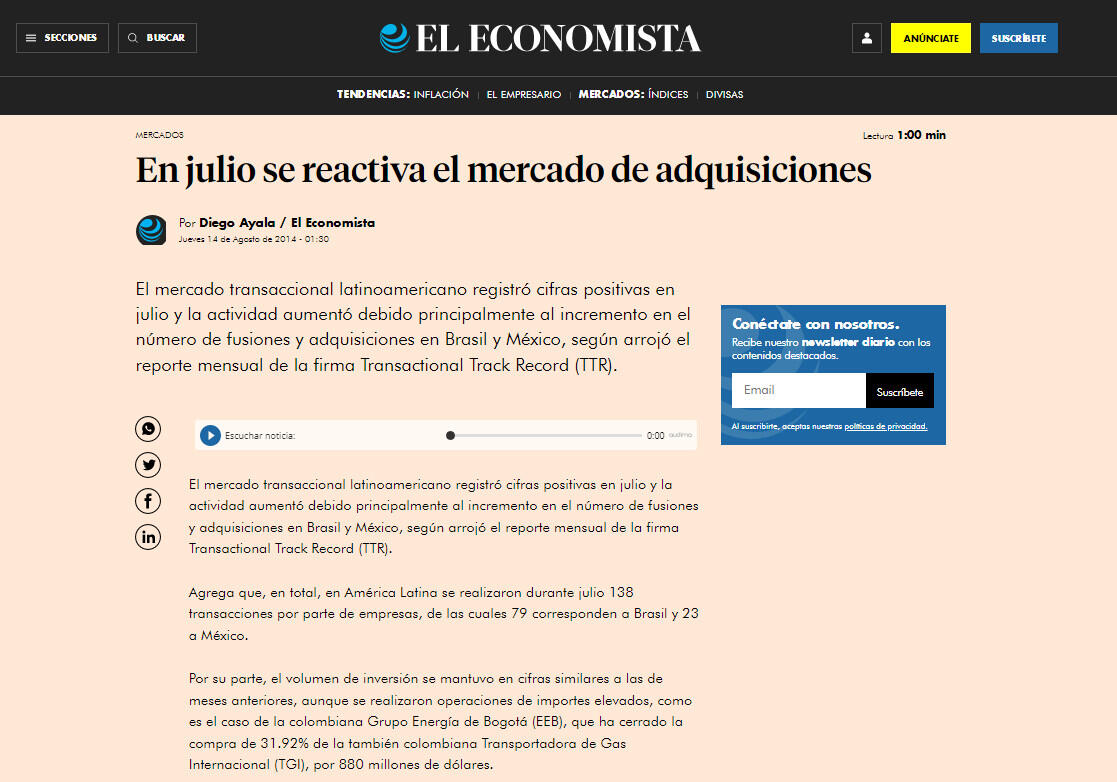 El mercado transaccional latinoamericano registró cifras positivas en julio y la actividad aumentó debido principalmente al incremento en el número de fusiones y adquisiciones en Brasil y México, según arrojó el reporte mensual de la firma Transactional Track Record (TTR).