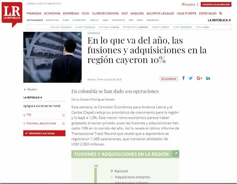Esta semana, la Comisión Económica para América Latina y el Caribe (Cepal) redujo su pronóstico de crecimiento para la región y lo bajó a 1,3%. Este menor ritmo económico parece haber golpeado al sector privado, pues las fusiones y adquisiciones han caído 10% en lo corrido del año. Así lo revela el último informe de Transactional Track Record que reveló que a septiembre se registraron 1.468 operaciones, que movieron alrededor de US$12.063 millones.