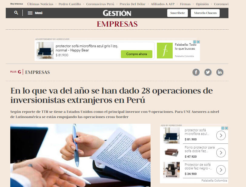 “En UNE ya estamos atendiendo a empresas en Colombia y Brasil; por ejemplo, en Brasil estamos atendiendo a un cliente en el segmento food & beverages en aeropuertos”, dijo el ejecutivo. Y en el caso peruano, durante el primer trimestre del año, al haber entrado en vigencia la ley de control de fusiones y adquisiciones, la actividad de los procesos transaccionales que estaban próximos a cerrar se aceleró.