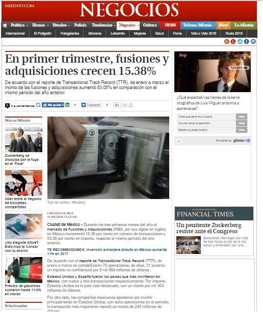 De acuerdo con el reporte de Transactional Track Record (TTR), de enero a marzo el monto de las fusiones y adquisiciones aumentó 53.05% en comparación con el mismo periodo del año anterior.