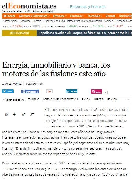 Si las perspectivas para el pasado año eran buenas para el negocio de fusiones y adquisiciones (M&A, por sus siglas en inglés), las expectativas de los expertos apuntan hacia otro año récord durante 2018. Según Enrique Gutiérrez, socio director de Financial Advisory de Deloitte, "este año va a ser muy activo e interesante en operaciones corporativas. Han vuelto las grandes operaciones porque el inversor internacional está muy activo en España y el segmento del mid-market está muy intenso". "Energía, inmobiliario, financiero y turismo serán los sectores más activos", añadió Gutiérrez durante un evento organizado por TTR y Deloitte.