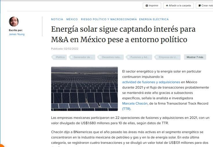 Las empresas mexicanas participaron en 22 operaciones de fusiones y adquisiciones en 2021, con un valor divulgado de US$1.680 millones para 10 de ellas, según datos de TTR. Chacón dijo a BNamericas que el año pasado las áreas más activas en el segmento energético se concentraron en la industria mexicana de petróleo y gas y en la de energía solar. En esta última categoría, se registraron cuatro transacciones y se divulgó un valor total de US$131 millones para dos de ellas.