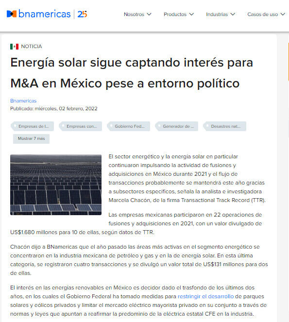 El sector energético y la energía solar en particular continuaron impulsando la actividad de fusiones y adquisiciones en México durante 2021 y el flujo de transacciones probablemente se mantendrá este año gracias a subsectores específicos, señala la analista e investigadora Marcela Chacón, de la firma Transactional Track Record (TTR).