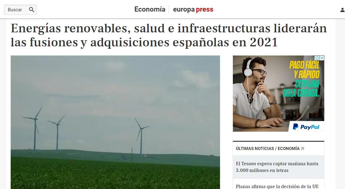Energías renovables, salud e infraestructuras liderarán las fusiones y adquisiciones españolas en 2021