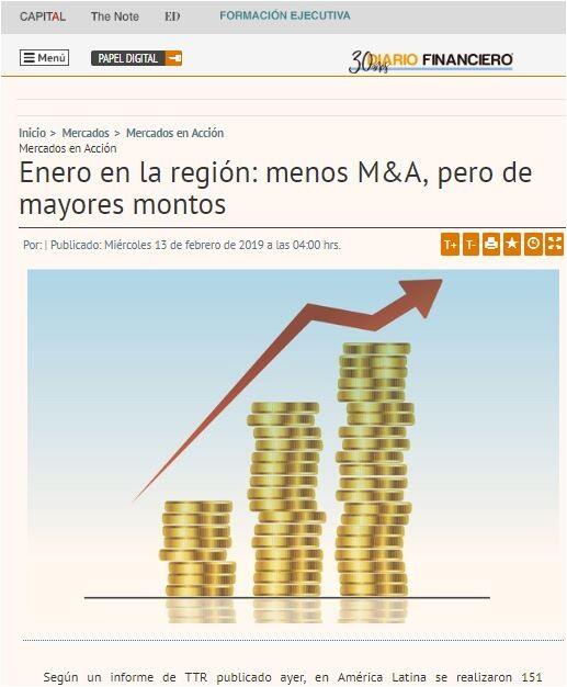 Según un informe de TTR publicado ayer, en América Latina se realizaron 151 operaciones de fusión y adquisición (M&A, por sus siglas en inglés) en enero de 2019. Con respecto al mismo mes en 2018, esto representa una caída de 8,48% en el número de transacciones, pero el mundo de las operaciones aumentó. En 12 meses, la cifra de importe no confidencial subió 17,15% hasta los US$ 7.488 millones.