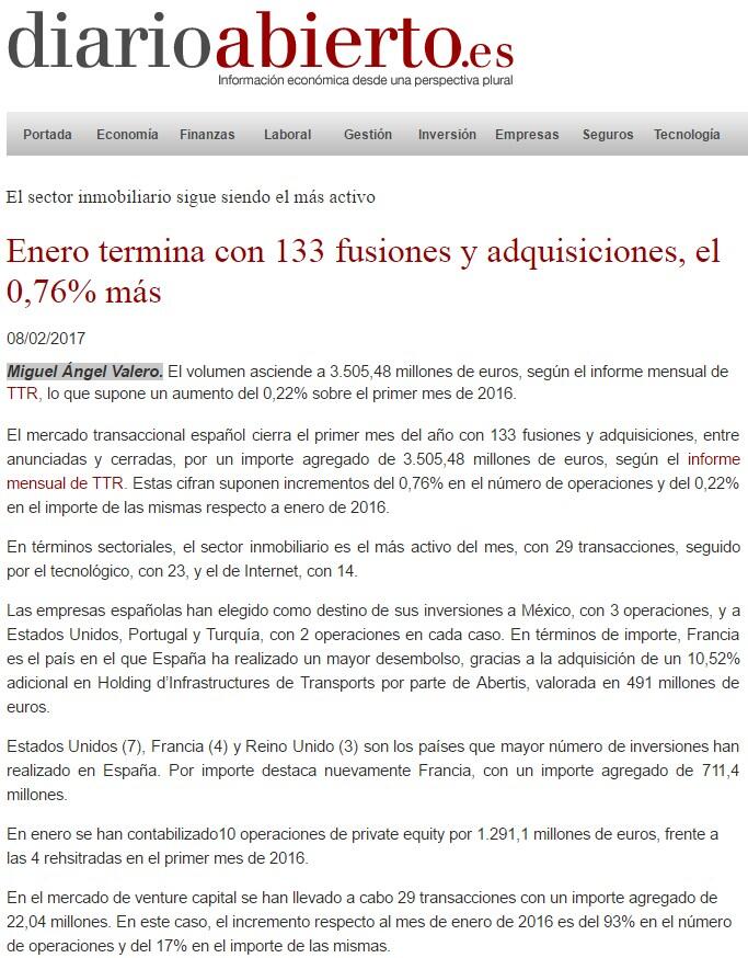 El mercado transaccional español cierra el primer mes del año con 133 fusiones y adquisiciones, entre anunciadas y cerradas, por un importe agregado de 3.505,48 millones de euros, según el informe mensual de TTR. Estas cifran suponen incrementos del 0,76% en el número de operaciones y del 0,22% en el importe de las mismas respecto a enero de 2016.