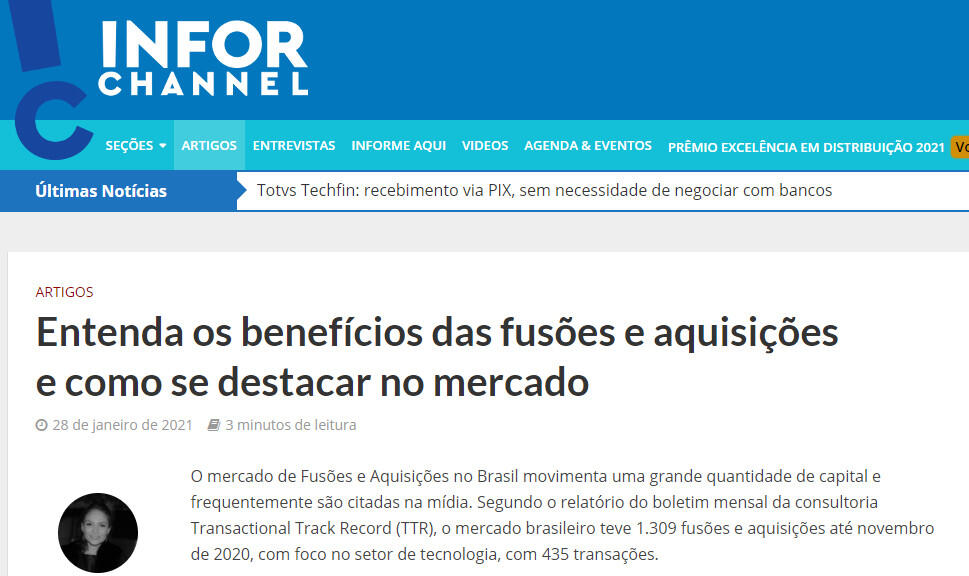 O mercado de Fusões e Aquisições no Brasil movimenta uma grande quantidade de capital e frequentemente são citadas na mídia. Segundo o relatório do boletim mensal da consultoria Transactional Track Record (TTR), o mercado brasileiro teve 1.309 fusões e aquisições até novembro de 2020, com foco no setor de tecnologia, com 435 transações.