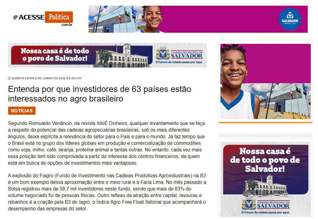 A explosão do Fiagro (Fundo de Investimento nas Cadeias Produtivas Agroindustriais) na B3 é um bom exemplo dessa aproximação entre o meio rural e a Faria Lima. No mês passado a Bolsa registrou mais de 58,7 mil investidores neste fundo, sendo que mais de 83% do volume negociado foi de pessoas físicas. Outro reflexo da atração entre capital, lavouras e rebanhos é a criação pela B3 do Iagro, o Índice Agro Free Float Setorial que acompanhará o desempenho das empresas do setor.