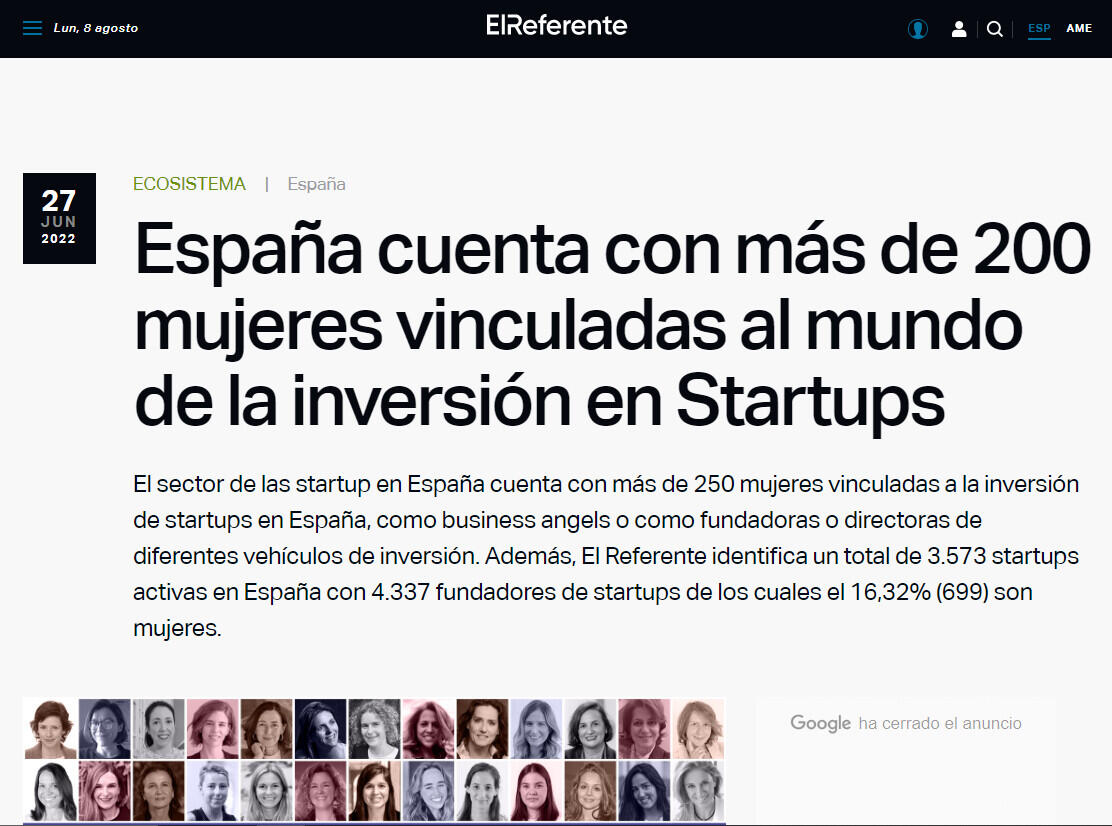 El sector de las startup en España cuenta con más de 250 mujeres vinculadas a la inversión de startups en España, como business angels o como fundadoras o directoras de diferentes vehículos de inversión. Además, El Referente identifica un total de 3.573 startups activas en España con 4.337 fundadores de startups de los cuales el 16,32% (699) son mujeres.