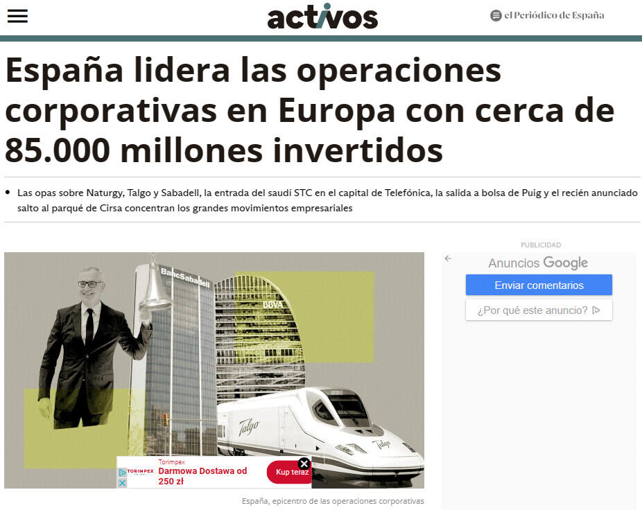 España está de moda en el mundo corporativo. Las ofertas públicas de adquisición (opas) sobre Naturgy, Talgo, Applus y Sabadell, la entrada de la saudí STC en Telefónica mediante la adquisición del 9,9% de su capital y la salida a bolsa de Puig encabezan las grandes operaciones empresariales en el último año y medio y copan el 70% de la inversión total, que alcanza la cifra de 85.000 millones de euros. Hay tres razones por las que los movimientos empresariales se han concentrado en nuestro país: el bajo coste de las empresas españolas en comparación con otras europeas, la alta presencia de actores internacionales en el accionariado del tejido empresarial español y la estabilidad del marco regulatorio.