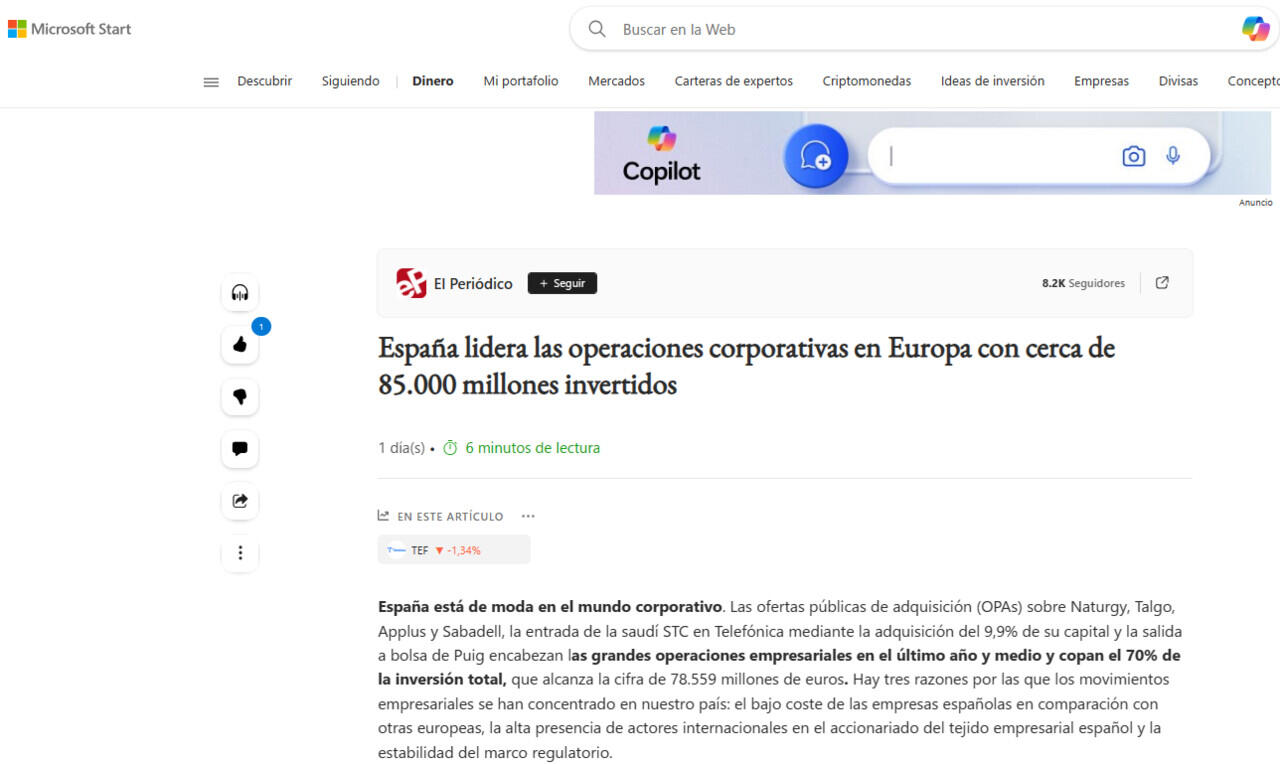 España está de moda en el mundo corporativo. Las ofertas públicas de adquisición (opas) sobre Naturgy, Talgo, Applus y Sabadell, la entrada de la saudí STC en Telefónica mediante la adquisición del 9,9% de su capital y la salida a bolsa de Puig encabezan las grandes operaciones empresariales en el último año y medio y copan el 70% de la inversión total, que alcanza la cifra de 85.000 millones de euros. Hay tres razones por las que los movimientos empresariales se han concentrado en nuestro país: el bajo coste de las empresas españolas en comparación con otras europeas, la alta presencia de actores internacionales en el accionariado del tejido empresarial español y la estabilidad del marco regulatorio.