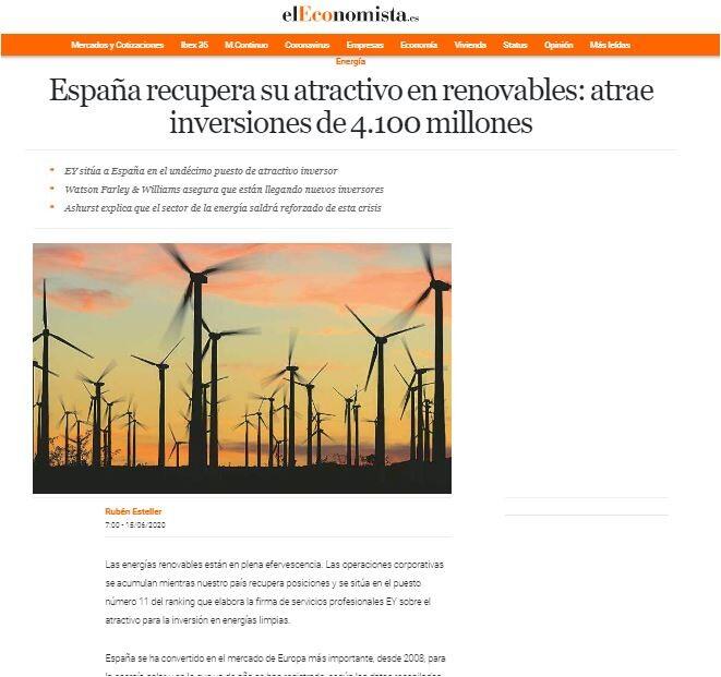 Entre los motivos para este renovado interés por las energías limpias en España figura, según explica María Pilar García Guijarro, socia directora de Watson Farley & Williams, "que hay poca alternativa de inversión en el entorno europeo con retornos razonables y un atractivo similar". Un extremo que también aprecia EY, que asegura que la mitad de los directivos considera que existe riesgo de que Europa sea menos atractiva para la inversión extranjera directa por la inestabilidad económica prevista como consecuencia del Covid-19.