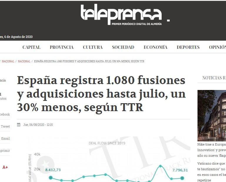 El mercado transaccional español ha registrado 1.080 fusiones y adquisiciones, anunciadas y cerradas, entre enero y julio, un 30% menos que en el ese periodo de 2019, según TTR.