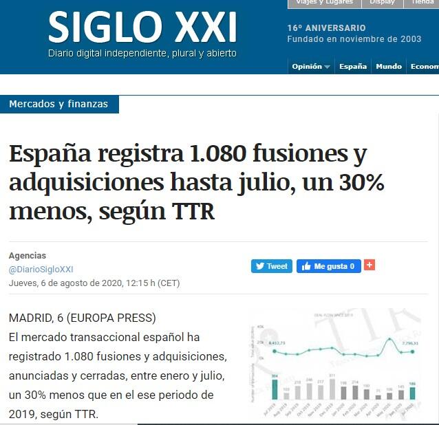 El mercado transaccional español ha registrado 1.080 fusiones y adquisiciones, anunciadas y cerradas, entre enero y julio, un 30% menos que en el ese periodo de 2019, según TTR.