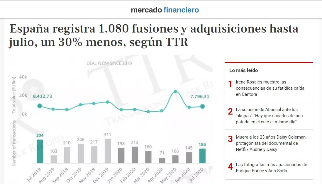 El mercado transaccional español ha registrado 1.080 fusiones y adquisiciones, anunciadas y cerradas, entre enero y julio, un 30% menos que en el ese periodo de 2019, según TTR.