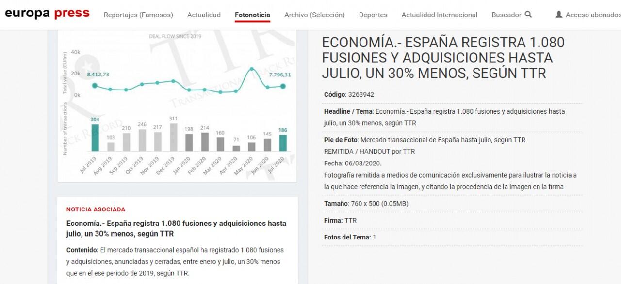 El mercado transaccional español ha registrado 1.080 fusiones y adquisiciones, anunciadas y cerradas, entre enero y julio, un 30% menos que en el ese periodo de 2019, según TTR.