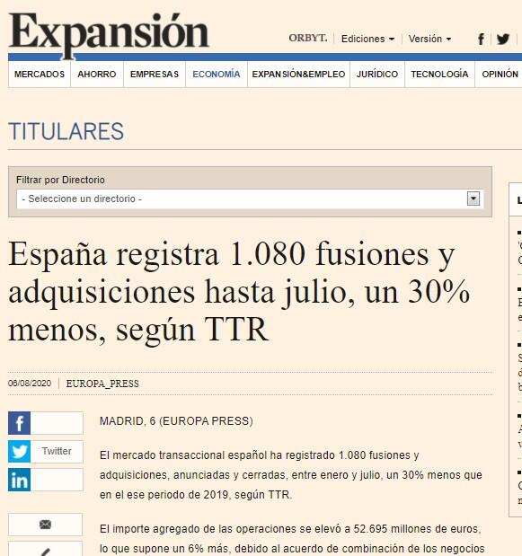 El mercado transaccional español ha registrado 1.080 fusiones y adquisiciones, anunciadas y cerradas, entre enero y julio, un 30% menos que en el ese periodo de 2019, según TTR.