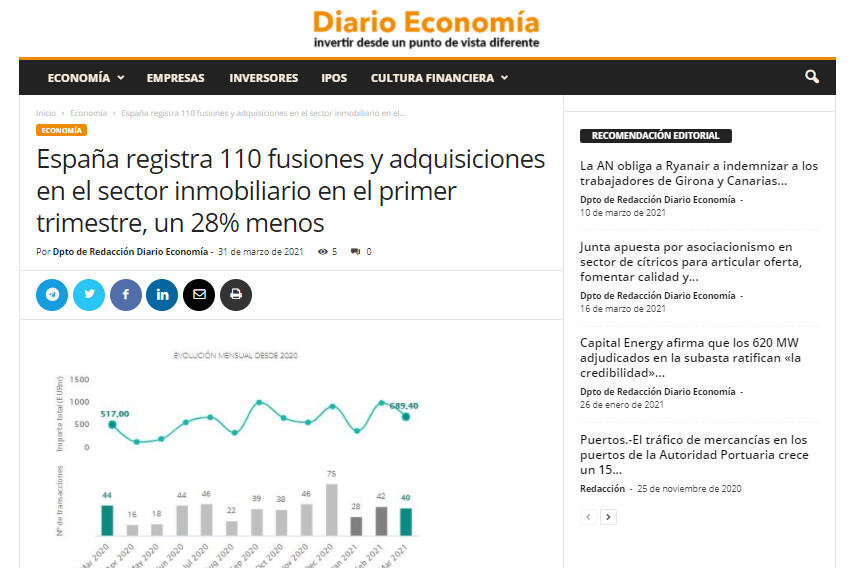 El mercado transaccional en el sector inmobiliario español ha registrado 110 fusiones y adquisiciones en el primer trimestre de 2021, lo que supone una caída del 28,1% en el número de operaciones respecto al mismo periodo del año anterior, con un importe de 2.060 millones de euros, un 21,8% menos, según un informe de TTR.
