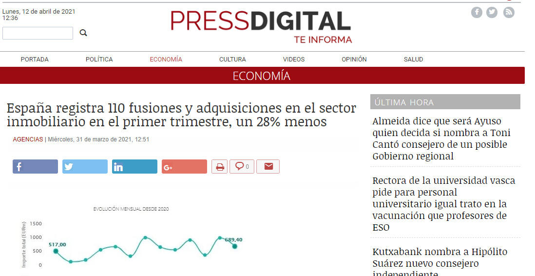 La transacción más relevante en este periodo fue la adquisición de un proyecto de 1.100 viviendas a Gestilar por parte de DWS Group, un fondo de infraestructuras controlado por Deutsche Bank, por un valor de 240 millones de euros.
