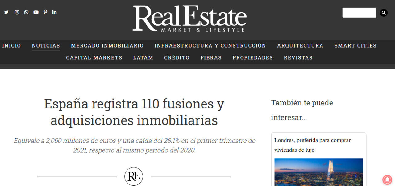 Según un informe, el mercado transaccional en el sector inmobiliario español registró 110 fusiones y adquisiciones en el primer trimestre de 2021 (1T21), un -28.1% respecto al mismo periodo del 2020.