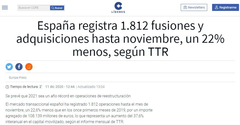 En cuanto a las perspectivas del mercado transaccional de España, el informe de TTR recoge las estimaciones de Allen & Overy Spain, que ha detectado más reestructuraciones societarias tras el verano y prevé que seguirán aumentando el próximo año. "Coincido con la mayoría de los que nos dedicamos a esto, que 2021 va a ser un año récord en operaciones de reestructuración", ha señalado Íñigo del Val, socio de fusiones y adquisiciones (M&A) de la firma.