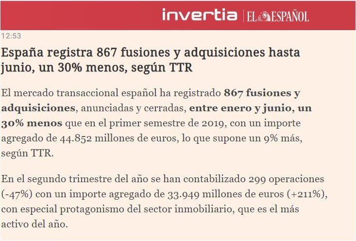 El mercado transaccional español ha registrado 867 fusiones y adquisiciones, anunciadas y cerradas, entre enero y junio, un 30% menos que en el primer semestre de 2019, con un importe agregado de 44.852 millones de euros, lo que supone un 9% más, según TTR.