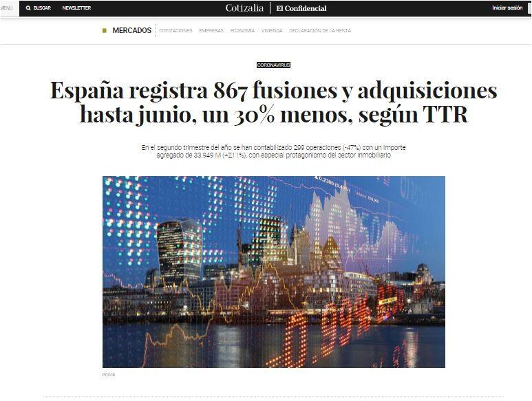 El mercado transaccional español ha registrado 867 fusiones y adquisiciones, anunciadas y cerradas, entre enero y junio, un 30% menos que en el primer semestre de 2019, con un importe agregado de 44.852 millones de euros, lo que supone un 9% más, según TTR.