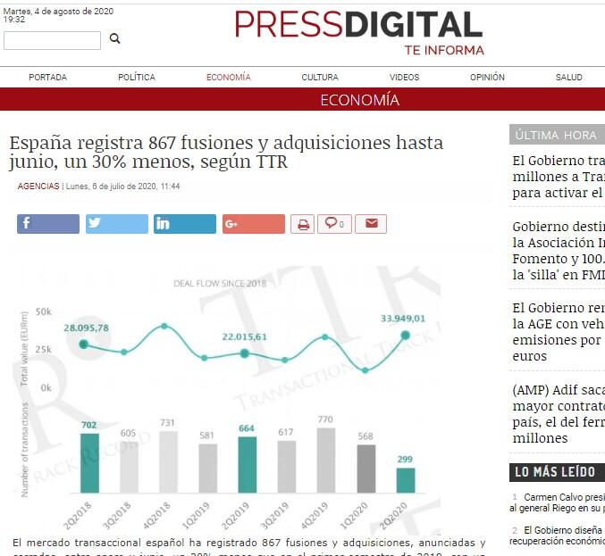El mercado transaccional español ha registrado 867 fusiones y adquisiciones, anunciadas y cerradas, entre enero y junio, un 30% menos que en el primer semestre de 2019, con un importe agregado de 44.852 millones de euros, lo que supone un 9% más, según TTR.