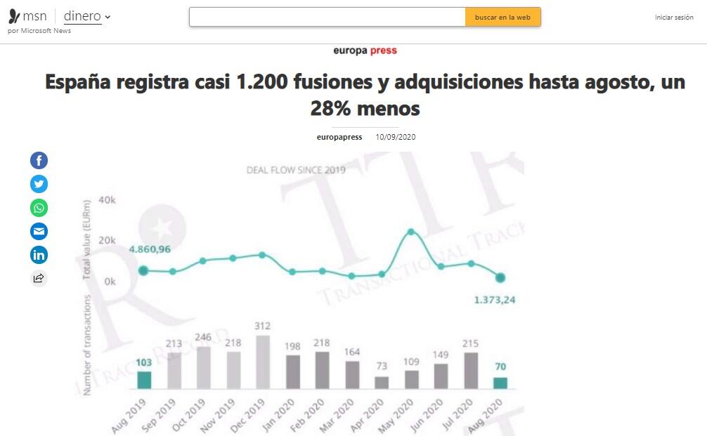 En agosto se han registrado 70 fusiones y adquisiciones, entre anunciadas y cerradas, por un importe agregado de 1.373 millones de euros. En términos sectoriales, el sector inmobiliario ha sido el más activo del año, con un total de 270 transacciones, seguido por el de tecnología, con 211 operaciones en este periodo.