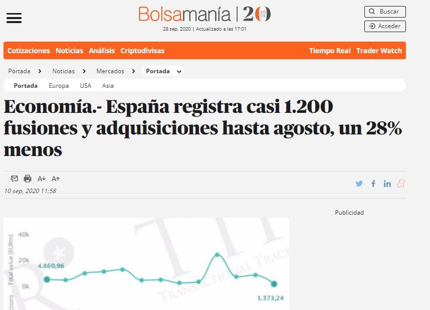 Espaņa registra casi 1.200 fusiones y adquisiciones hasta agosto, un 28% menos