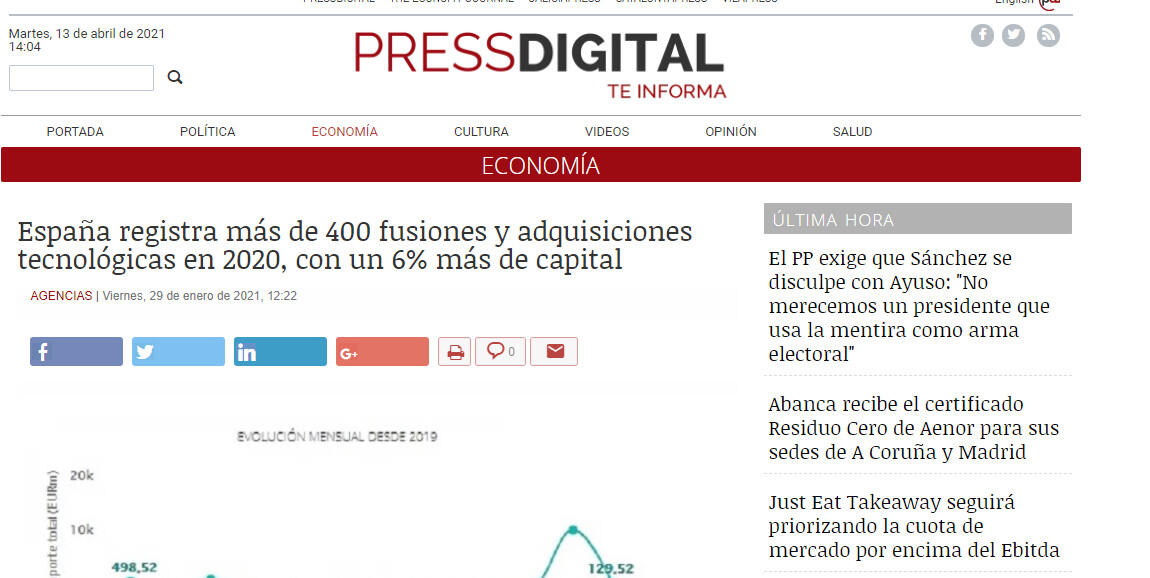 El mercado transaccional español ha registrado un total de 404 fusiones y adquisiciones entre anunciadas y cerradas en el sector de tecnología en 2020, con un importe agregado de 13.496 millones de euros, lo que supone un crecimiento del 6%.