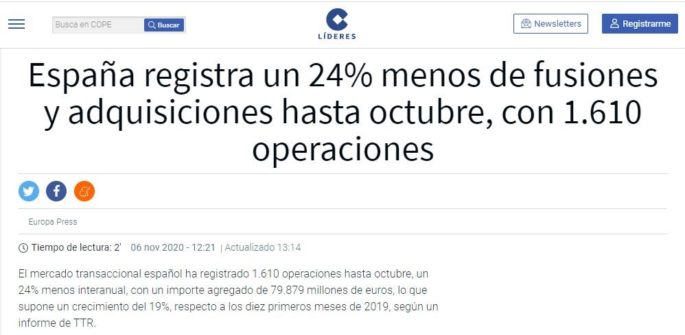 El mercado transaccional español ha registrado 1.610 operaciones hasta octubre, un 24% menos interanual, con un importe agregado de 79.879 millones de euros, lo que supone un crecimiento del 19%, respecto a los diez primeros meses de 2019, según un informe de TTR.