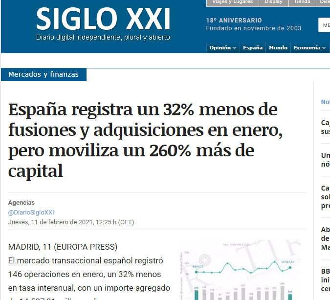 España registra un 32% menos de fusiones y adquisiciones en enero, pero moviliza un 260% más de capital