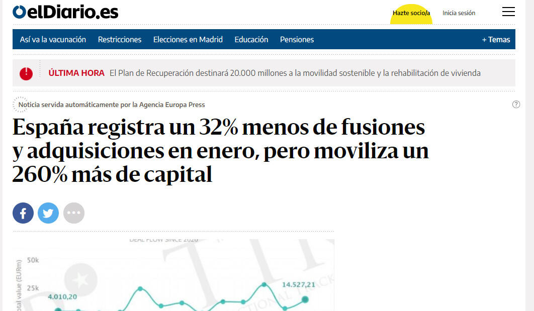 España registra un 32% menos de fusiones y adquisiciones en enero, pero moviliza un 260% más de capital