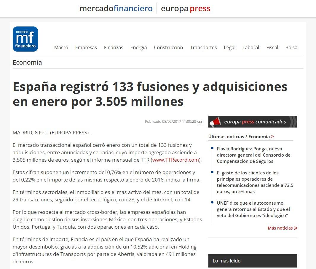 El mercado transaccional español cerró enero con un total de 133 fusiones y adquisiciones, entre anunciadas y cerradas, cuyo importe agregado asciende a 3.505 millones de euros, según el informe mensual de TTR (www.TTRecord.com).