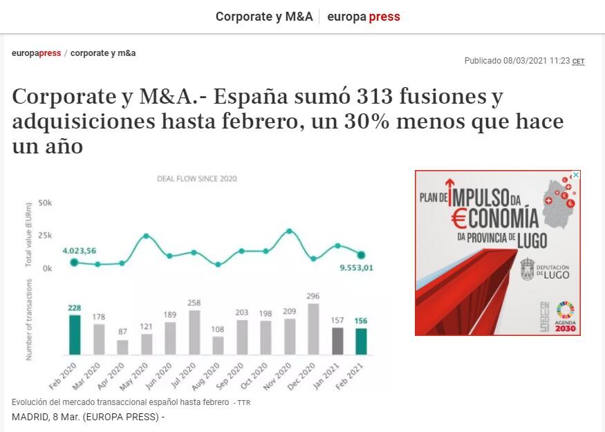 El mercado transaccional español ha registrado 313 transacciones hasta el mes de febrero, lo que supone un 30% menos que en los dos primeros meses de 2020, según los datos de TTR, en colaboración con Datasite.