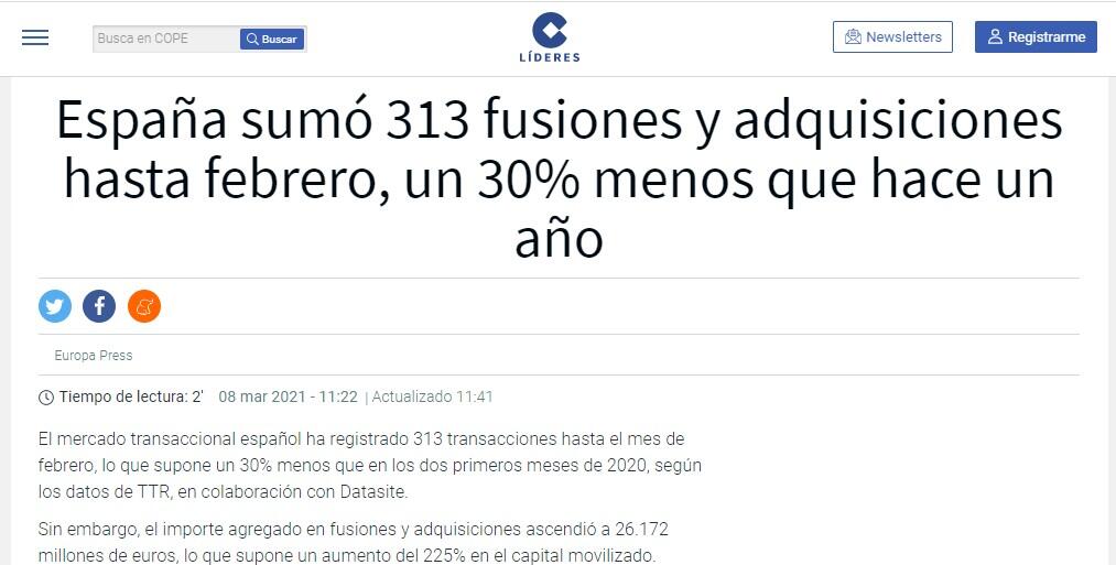 El mercado transaccional español ha registrado 313 transacciones hasta el mes de febrero, lo que supone un 30% menos que en los dos primeros meses de 2020, según los datos de TTR, en colaboración con Datasite.