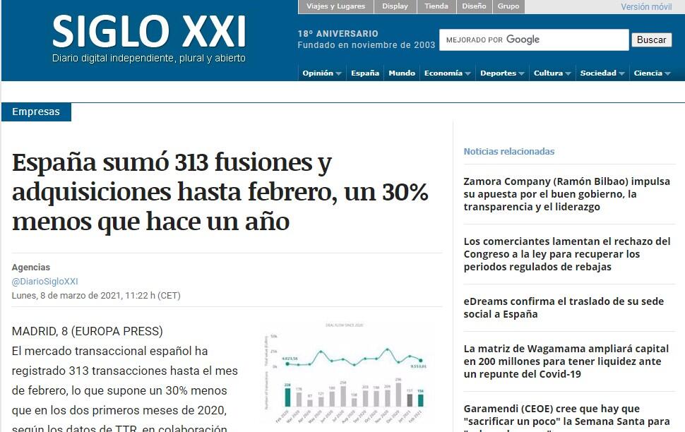 El mercado transaccional español ha registrado 313 transacciones hasta el mes de febrero, lo que supone un 30% menos que en los dos primeros meses de 2020, según los datos de TTR, en colaboración con Datasite.