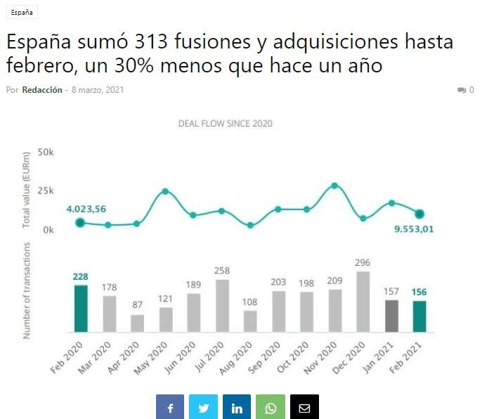 En el mes de febrero se han registrado 156 fusiones y adquisiciones, entre anunciadas y cerradas, por un importe agregado de 9.553,01 millones de euros.