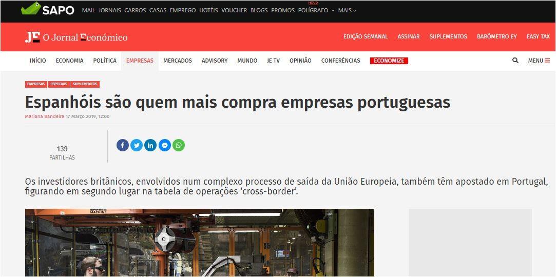 Quanto às empresas portuguesas, ao longo de 2018, injetaram 1.071,32 milhões de euros em empresas de Espanha, 426,93 milhões de euros em brasileiras e 230,77 milhões de euros em norte-americanas. O cenário out-bound apresentou mais de quatro dezenas de aquisições, sendo que a maioria se centrou no segmento da Tecnologia. É uma tendência que se mantém no início deste ano, como por exemplo com a entrada da Sonae IM no capital da ViSenze, uma empresa de Singapura que opera na área da inteligência artificial e angariou 17,69 milhões de euros em uma ronda de financiamento series C.