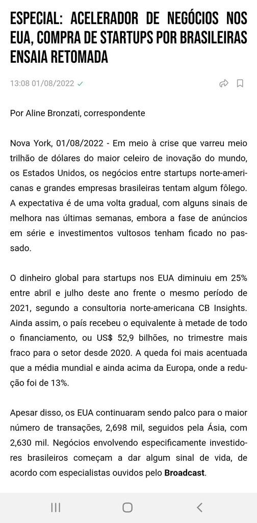 O ambiente de novos negócios entre empresas brasileiras e startups dos EUA contrasta com o visto no início do ano. Na ocasião, vários contratos foram anunciados. Em geral, o interesse nas novatas norte-americanas tem sido uma moeda de troca para colocar os pés - ou reforçar - na maior economia do mundo.