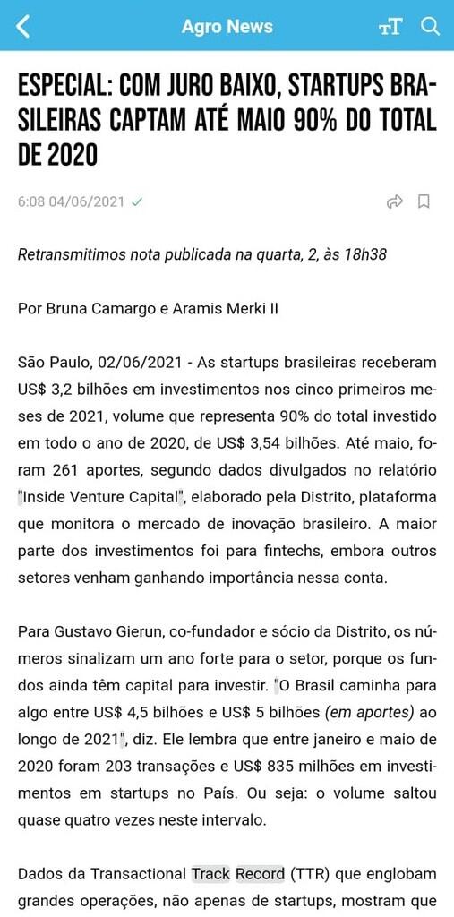 Para Gustavo Gierun, co-fundador e sócio da Distrito, os números sinalizam um ano forte para o setor, porque os fundos ainda têm capital para investir. "O Brasil caminha para algo entre US$ 4,5 bilhões e US$ 5 bilhões (em aportes) ao longo de 2021", diz. Ele lembra que entre janeiro e maio de 2020 foram 203 transações e US$ 835 milhões em investimentos em startups no País. Ou seja: o volume saltou quase quatro vezes neste intervalo.
