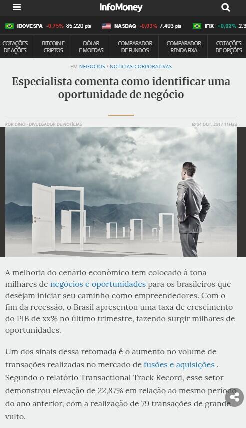 Dessa forma, uma das maneiras para identificar oportunidades de negócio é buscar por empresas à venda , que pode oferecer um caminho mais rápido e assertivo para entrar no mundo dos negócios. "Esse segmento tem espaço para avançar mais, já que muitos empresários estão começando a enxergar a alternativa de colocarem seu negócios à venda", conclui.