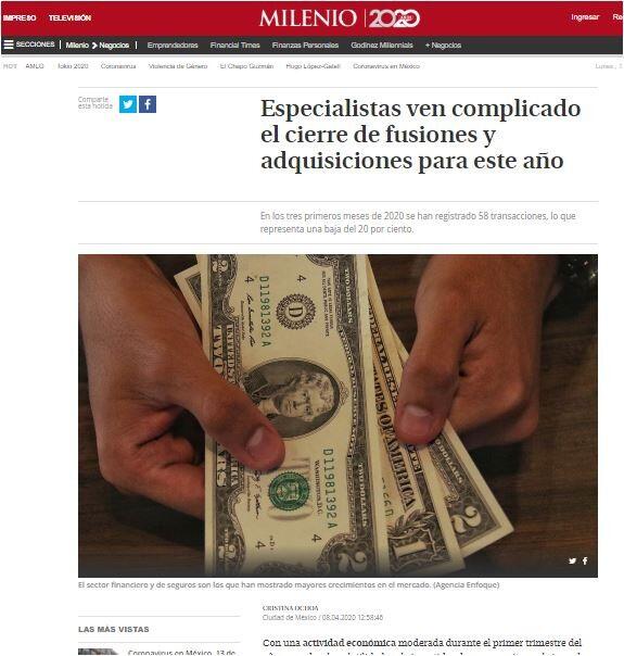 "Las expectativas de los vendedores con las ofertas de compra de posibles inversores en las últimas semanas ha frenado la capacidad de evaluar de manera efectiva los valores de algunos activos y, por consiguiente, es probable que se dilate por un tiempo la dinámica que llevaba México en el mercado M&A. Si continúa el entorno actual, creado por la constante devaluación del peso mexicano, los repentinos precios del petróleo, y sumado a la incertidumbre generada por la covid-19, podría representar otro reto para 2020 en el mercado M&A mexicano", expuso.