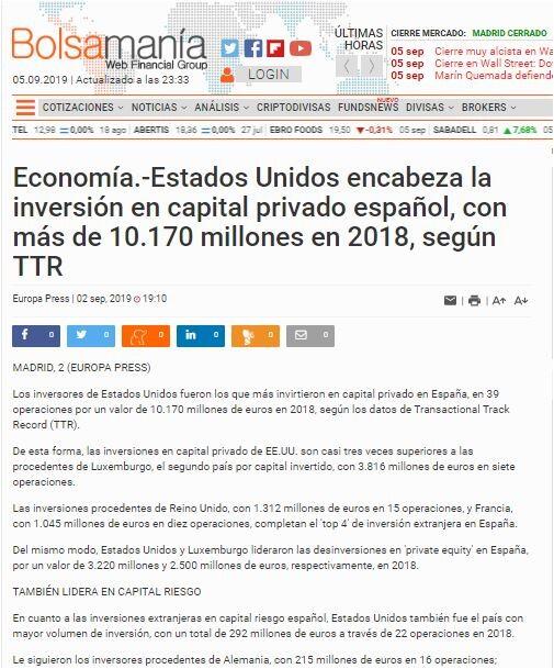Estados Unidos encabeza la inversión en capital privado español, con más de 10.170 millones en 2018, según TTR